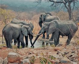 Our exciting news is the 5 bull elephants that appear to have taken up residence despite all the construction going on - and breeding heard that has followed them into our private valley - cows, youngsters and calves, numbering almost 100. One bull (named Barbar) feels very much at home in our construction site cap, often hindering the way to the camp long drop or bucket shower..